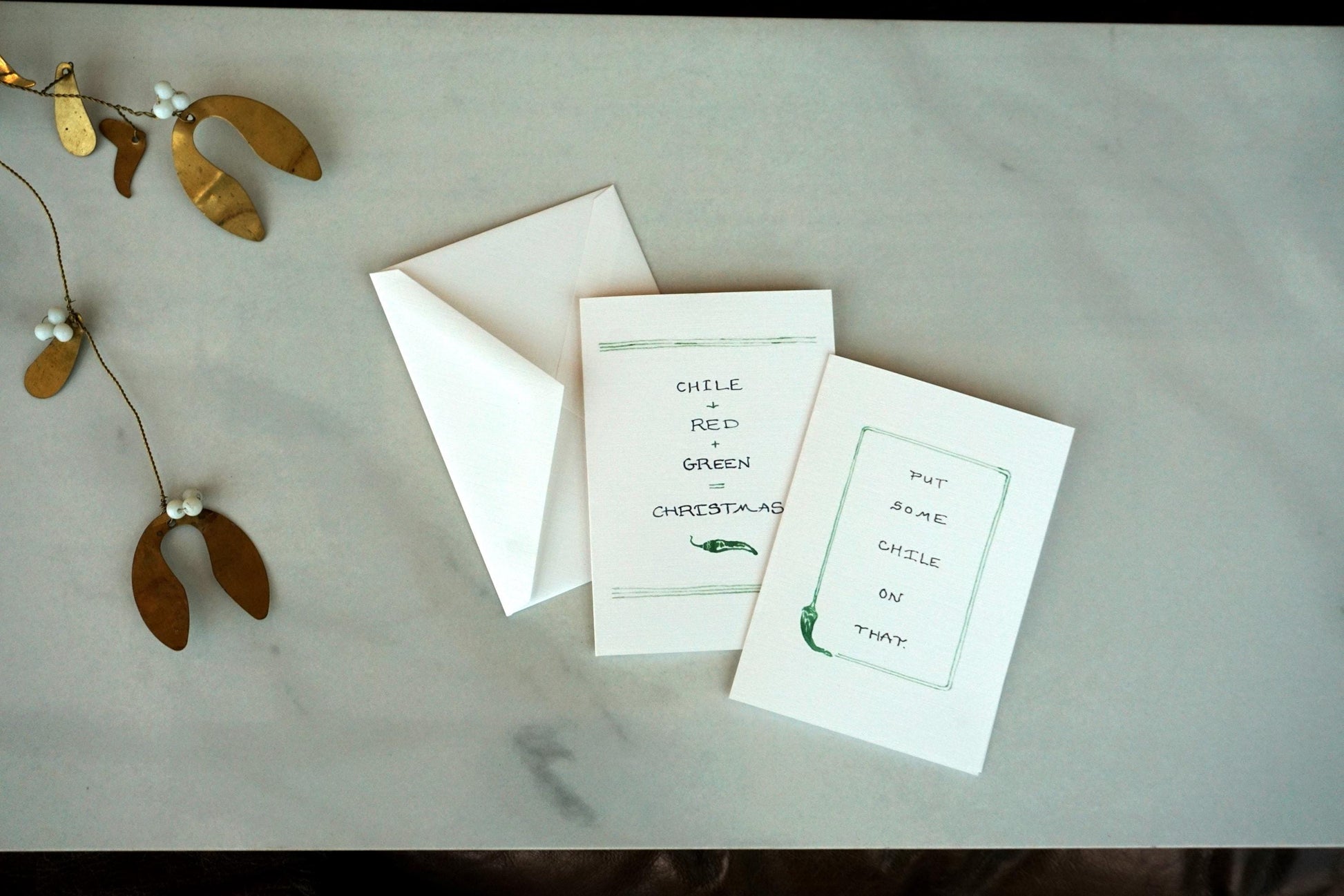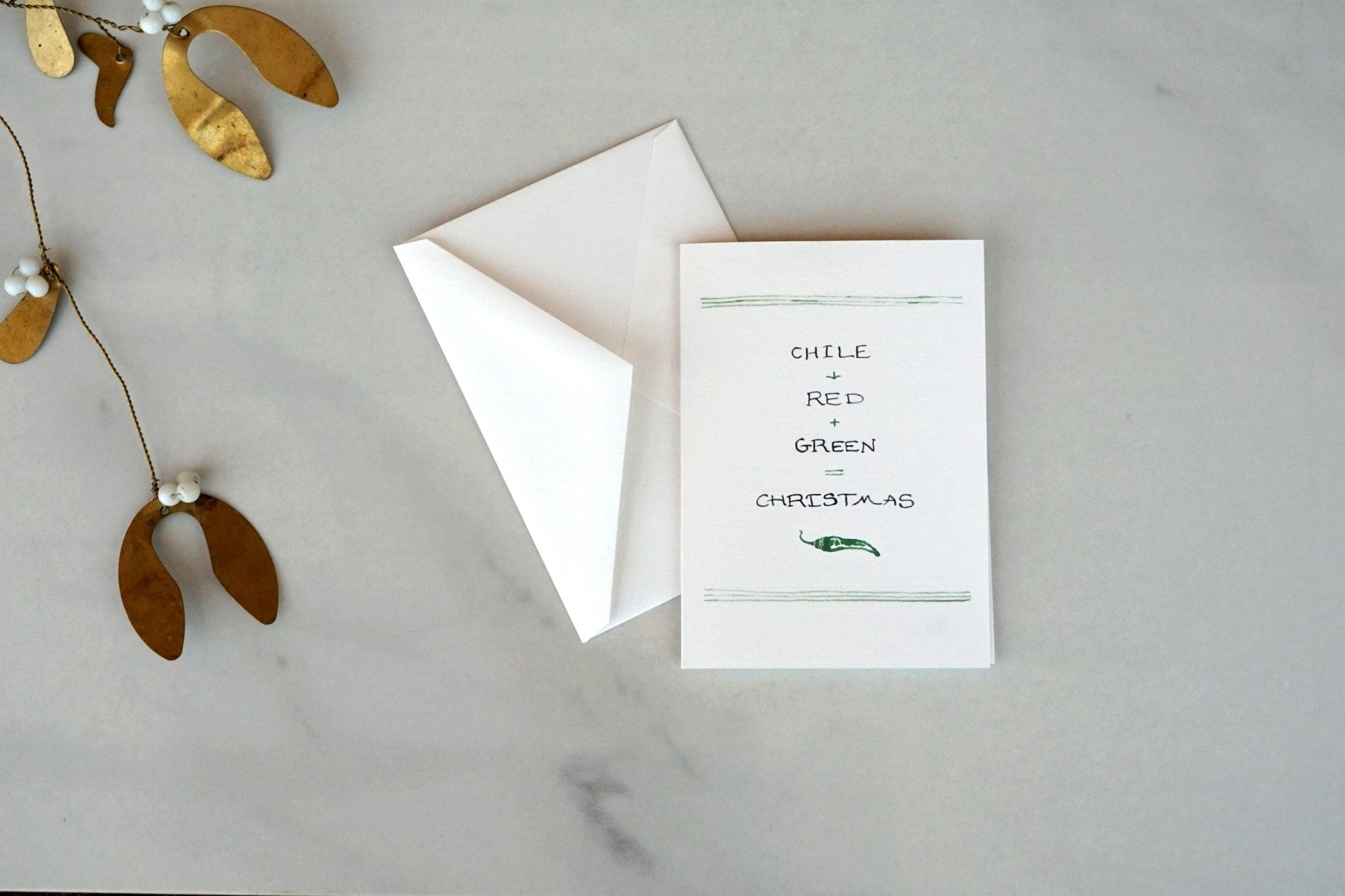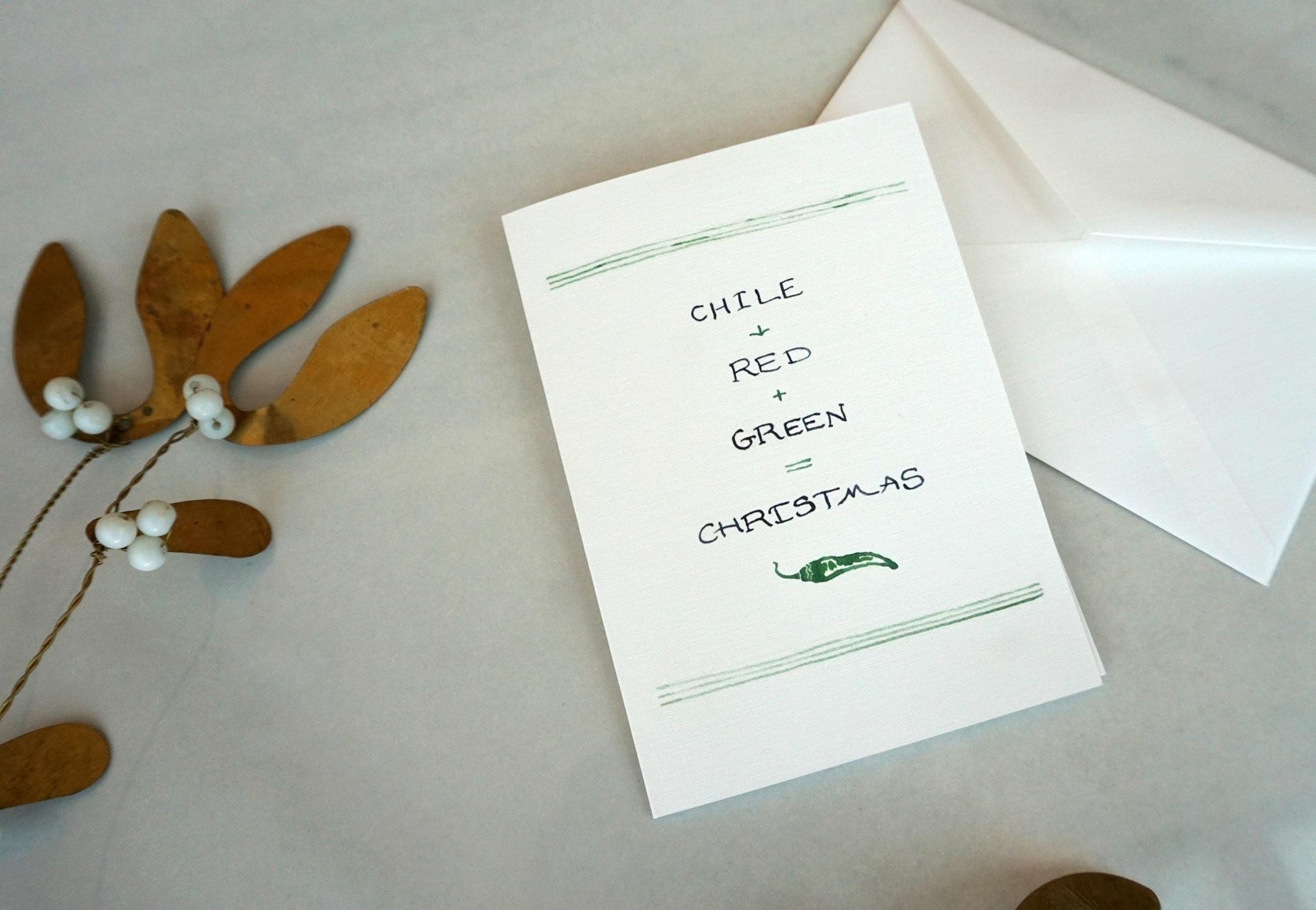 A green watercolor lines on top and bottom with handwritten text: “Chile -> Red + Green = Christmas” with a green chile underneath.
