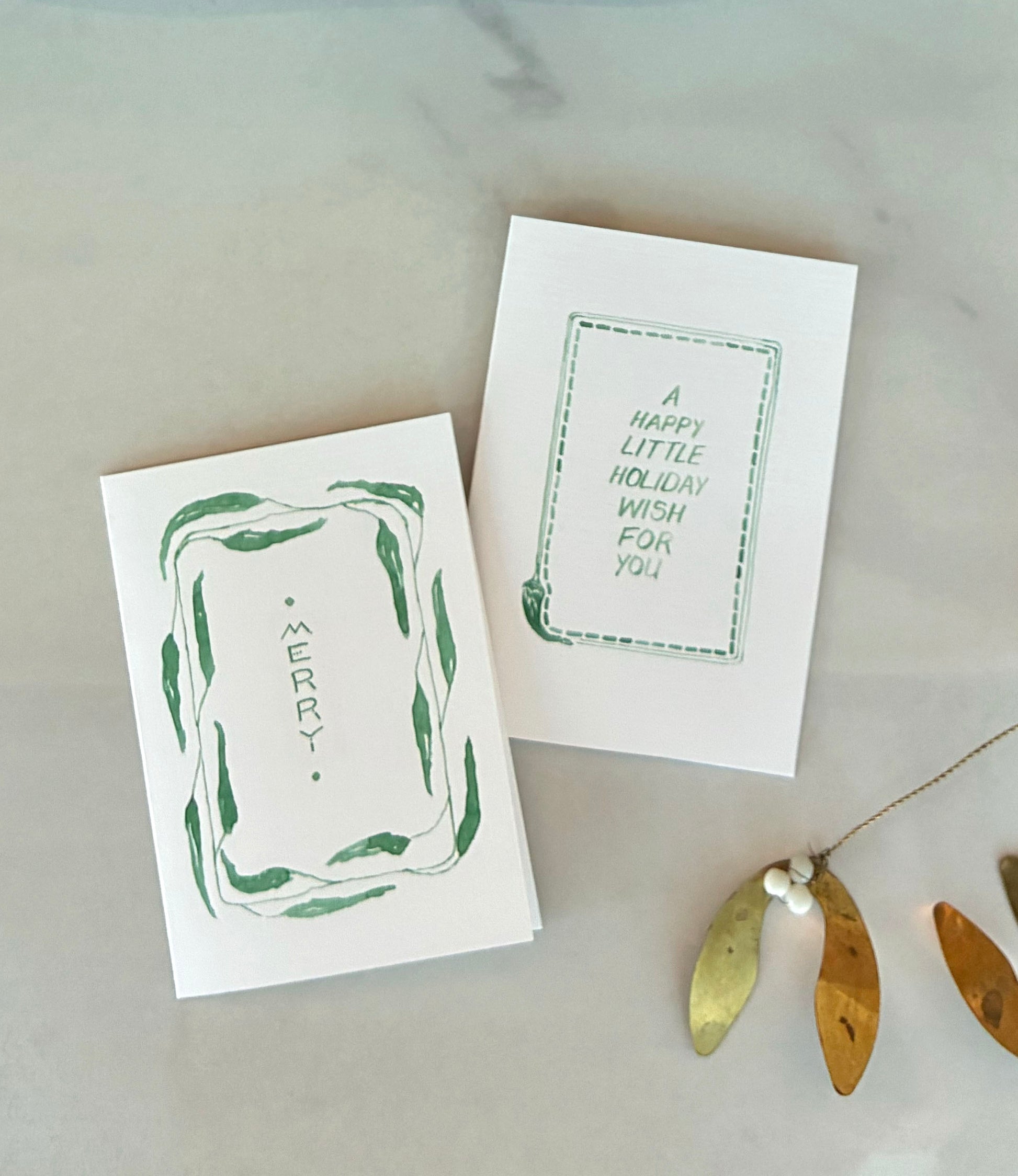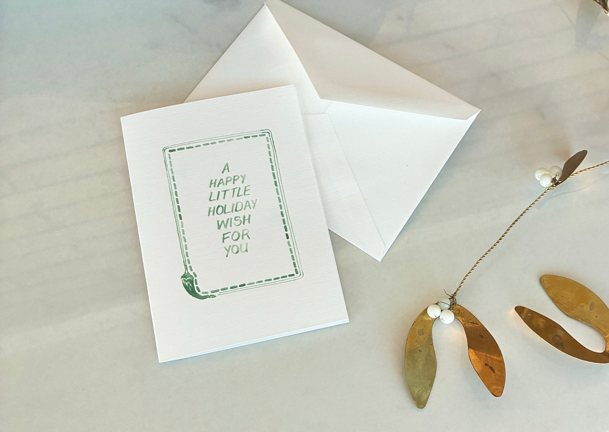 Mini holiday card with hand painted green chile and dashed line border and watercolor lettering "a happy little holiday wish for you" arranged vertically in the center.
