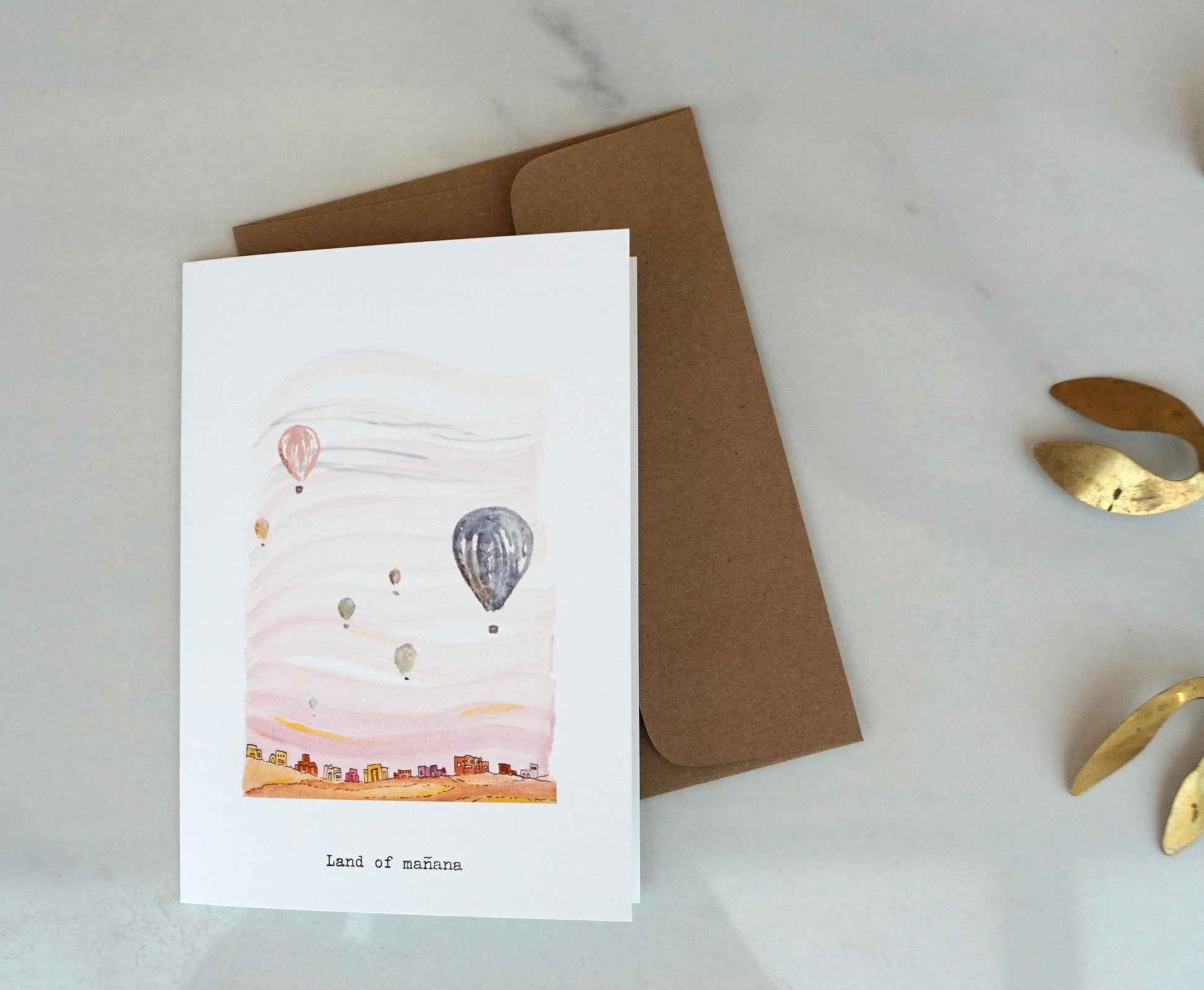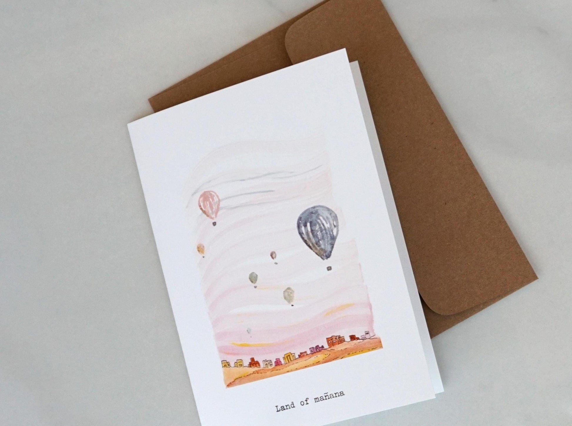 A miniature landscape of southwestern homes dotting the horizon and a big light pink sky filled with hot air balloons and typewritten text: “Land of mañana”.