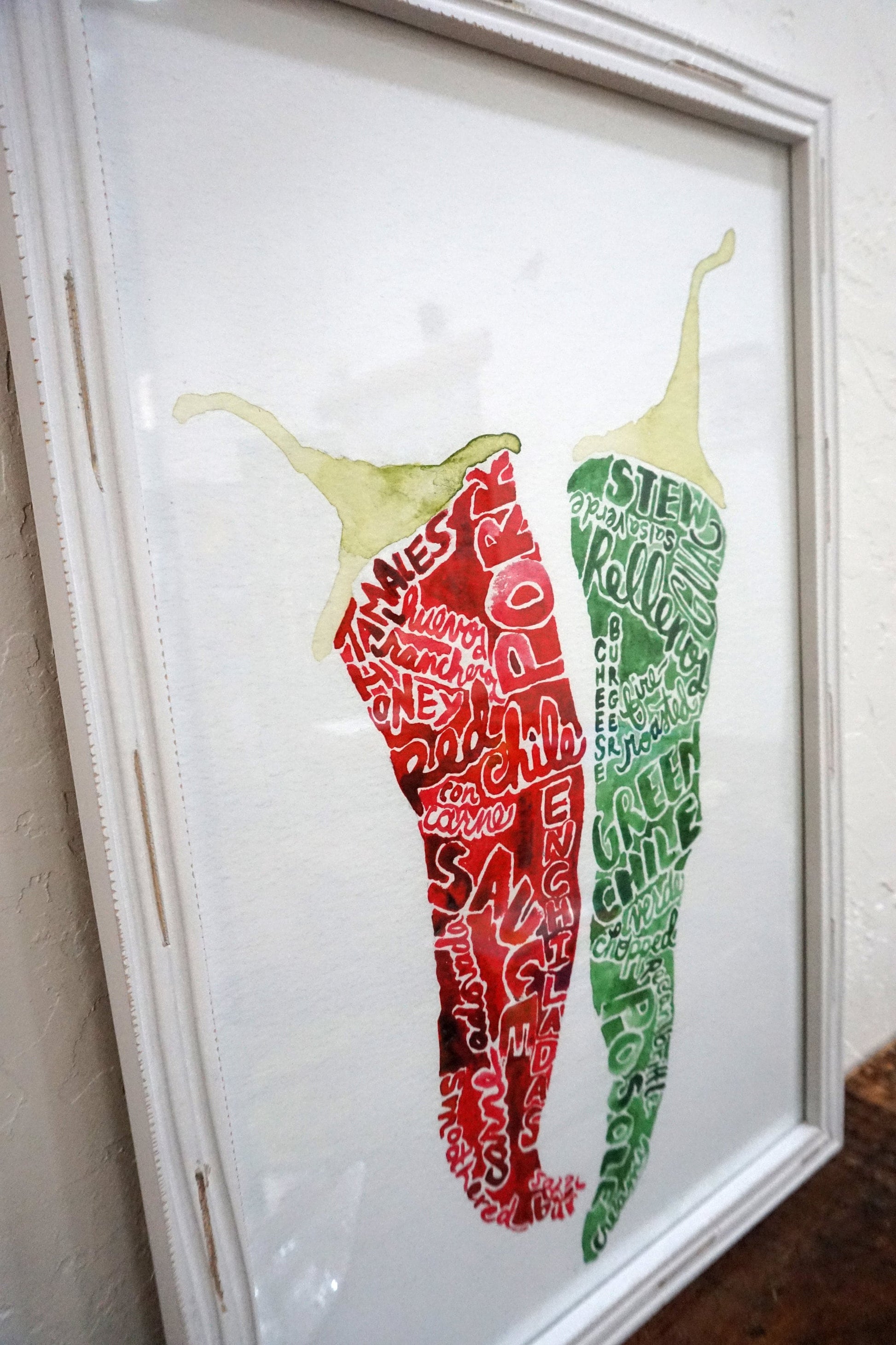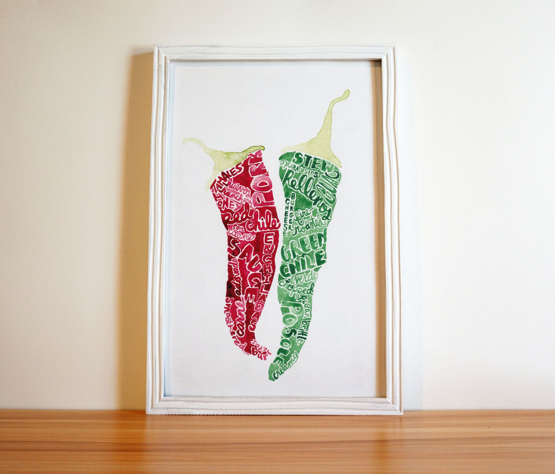The Chile Poster is a watercolor of a red and a green chile pepper in large poster format. To create the chiles I have used popular chile dishes of the region to form the shape of the chiles. The poster has a watercolor paper texture printed background.